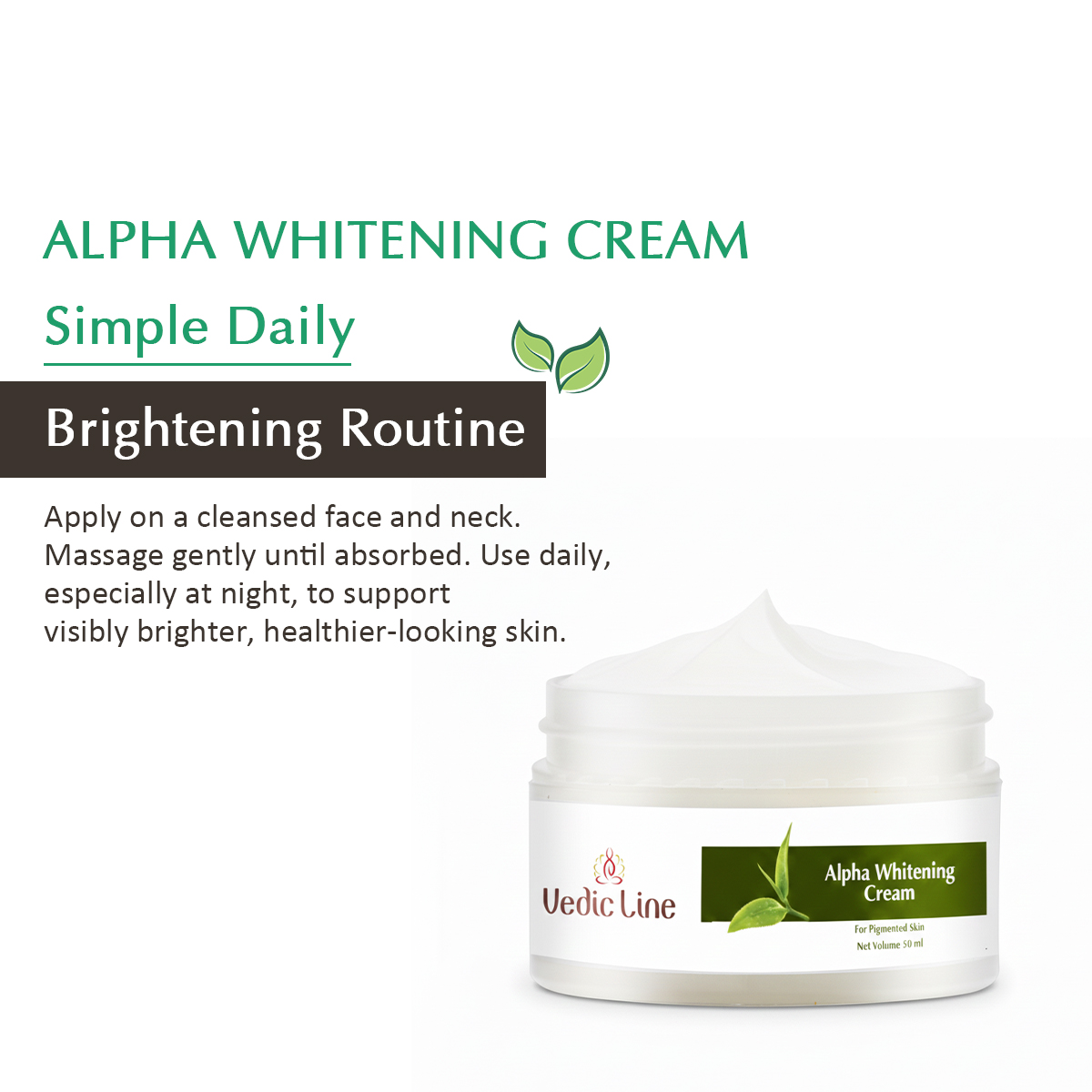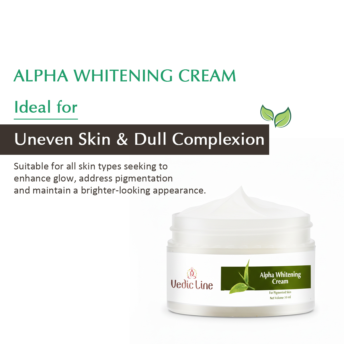 Glow up, the skin-smart way with Vedciline Alpha Whitening Cream, your daily formula for clear, radiant, and even-toned skin. Designed for those who want more than just fairness, this cream delivers real results by targeting pigmentation, dark spots, and uneven tone, while nourishing your skin from within.