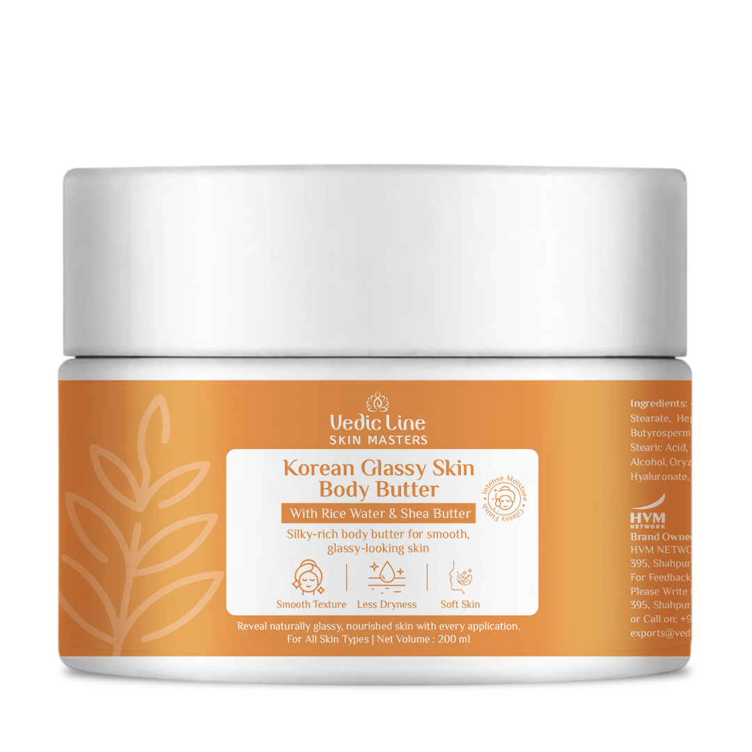Glass skin is no longer just for your face. Vedicline Korean Skin Glassy Body Butter brings the magic of Korean beauty to your entire body, giving you skin that looks smooth, bright, and beautifully radiant from head to toe. This rich, creamy body butter is made with three of the most powerful skin-transforming ingredients — Rice Water, Hyaluronic Acid, and Shea Butter — all working together to give you the softest, most glowing skin of your life.