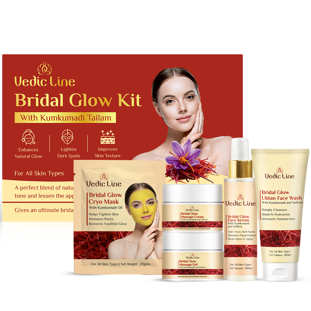 Achieve glowing and dazzling skin effortlessly with the Bridal Glow Kit with Kumkumadi Tailam. Designed for those who wish to radiate beauty on their special day and beyond, this all-in-one kit combines the power of natural ingredients with the expertise of professional skincare.